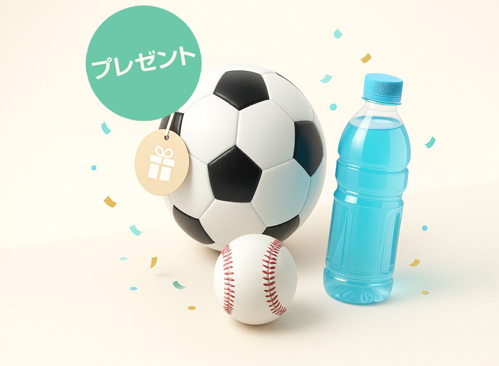 今ならサイト掲載特典としてサッカーボール・野球ボール・水分補給用ドリンクをプレゼントキャンペーン実施中!!